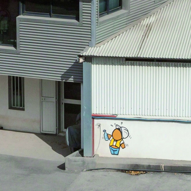 Le travail avec Soreco-Sigemat est parti d’une demande de Dimitri Losfelt, directeur de l’entreprise, qui connaît bien l’artiste. L’objectif était de « rendre ce monde brut un peu plus doux ». De son côté, Jace aimait l’idée de décorer les silos de la centrale à béton. « J’en avais fait un quelques années plus tôt dans des conditions un peu acrobatiques… Puis, j’aimais le côté “industriel” du site. Ça me rappelle un peu les engrenages que l’on voit dans “Les temps modernes” de Charlie Chaplin. » C’est donc naturellement que ces engrenages sont présents sur le site Soreco-Sigemat revisité par Jace. Et au milieu, figure le Gouzou. « Il s’agit d’un petit personnage, qui m’accompagne depuis 25 ans. Le Gouzou, c’est vous, c’est moi, c’est un être humain, avec toutes ses émotions. »